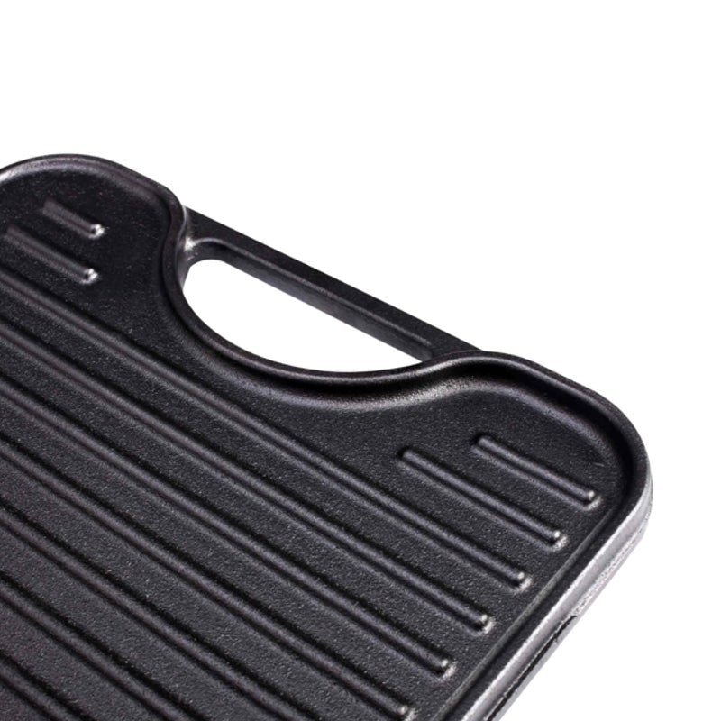 - The Griddle features easy-grip double handles and a dual-sided design with raised edges for grilling on one side and a flat smooth surface on the other.
