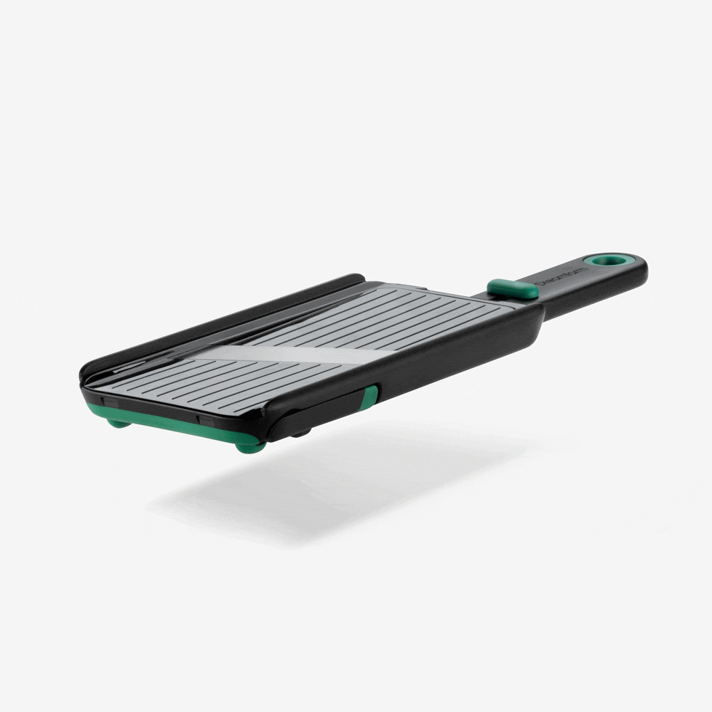 Razor-sharp Japanese stainless steel blade slices 1mm, 2mm and 3mm thicknesses, and locks closed for safe storage. Integrated non-slip foot folds out to securely raise Nocutu and allow for more food slices to stack underneath without jamming.