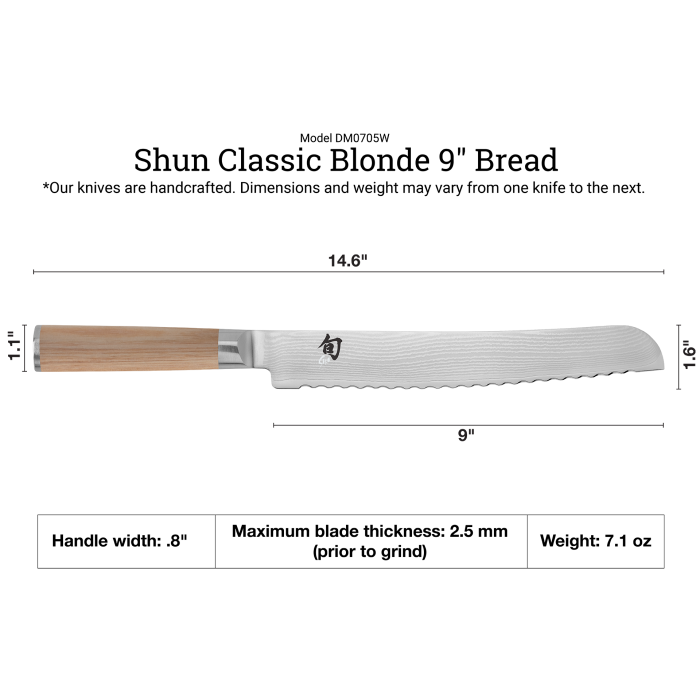 After a chef's knife and a paring knife, some cooks say that the knife they cannot live without is their bread knife. If you are looking for a new bread knife, this blonde-handled version of Shun's Classic Bread Knife is a beautiful choice. Don't ruin a fresh loaf of bread by squashing it beneath the blade of a dull knife. Instead, use the wide, serrations of the Shun Classic Blonde Bread Knife to simply glide through crusty or tender bread. The undulating serrations provide the power you need to gently saw through a crusty loaf without tearing the tender interior. And it works equally well on very soft breads and even pastries.